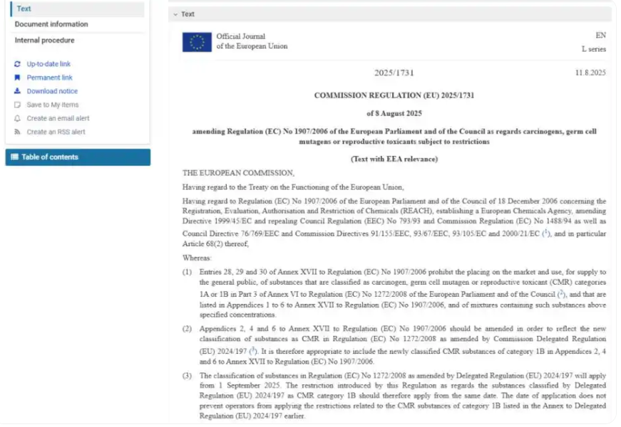 2025年8月11日,歐盟委員會在《歐盟官方公報》正式發布了新法規 (EU) 2025/1731,對REACH法規附件XVII中致...